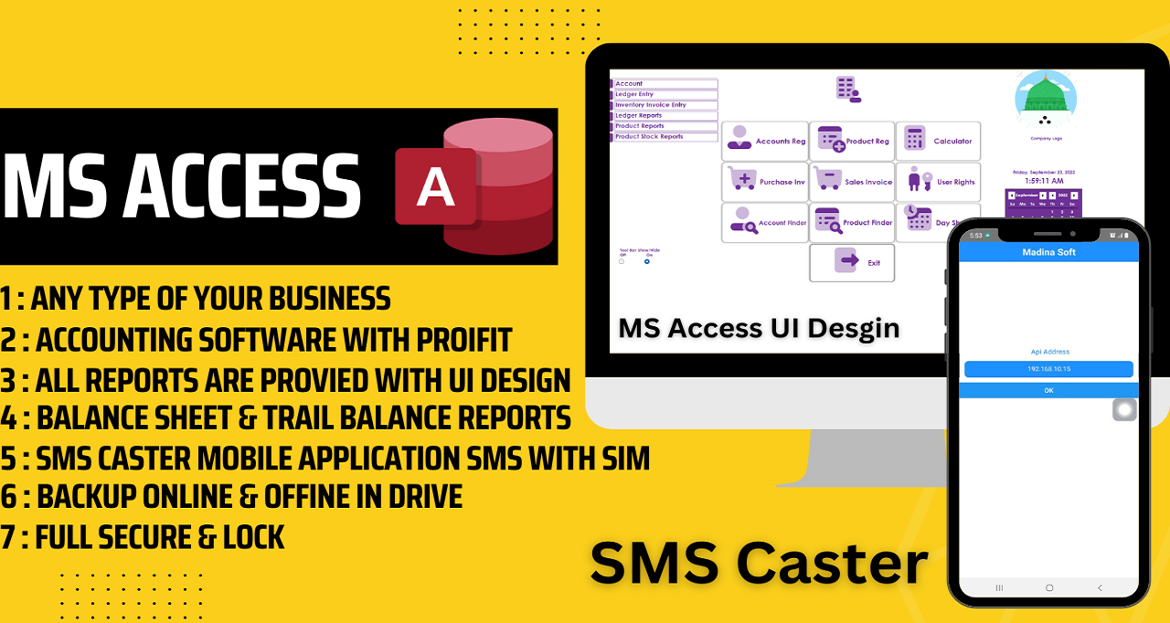 For single end product used by you or one client. Ms Access UI Design 2022 Format with Recovery & SMS App.